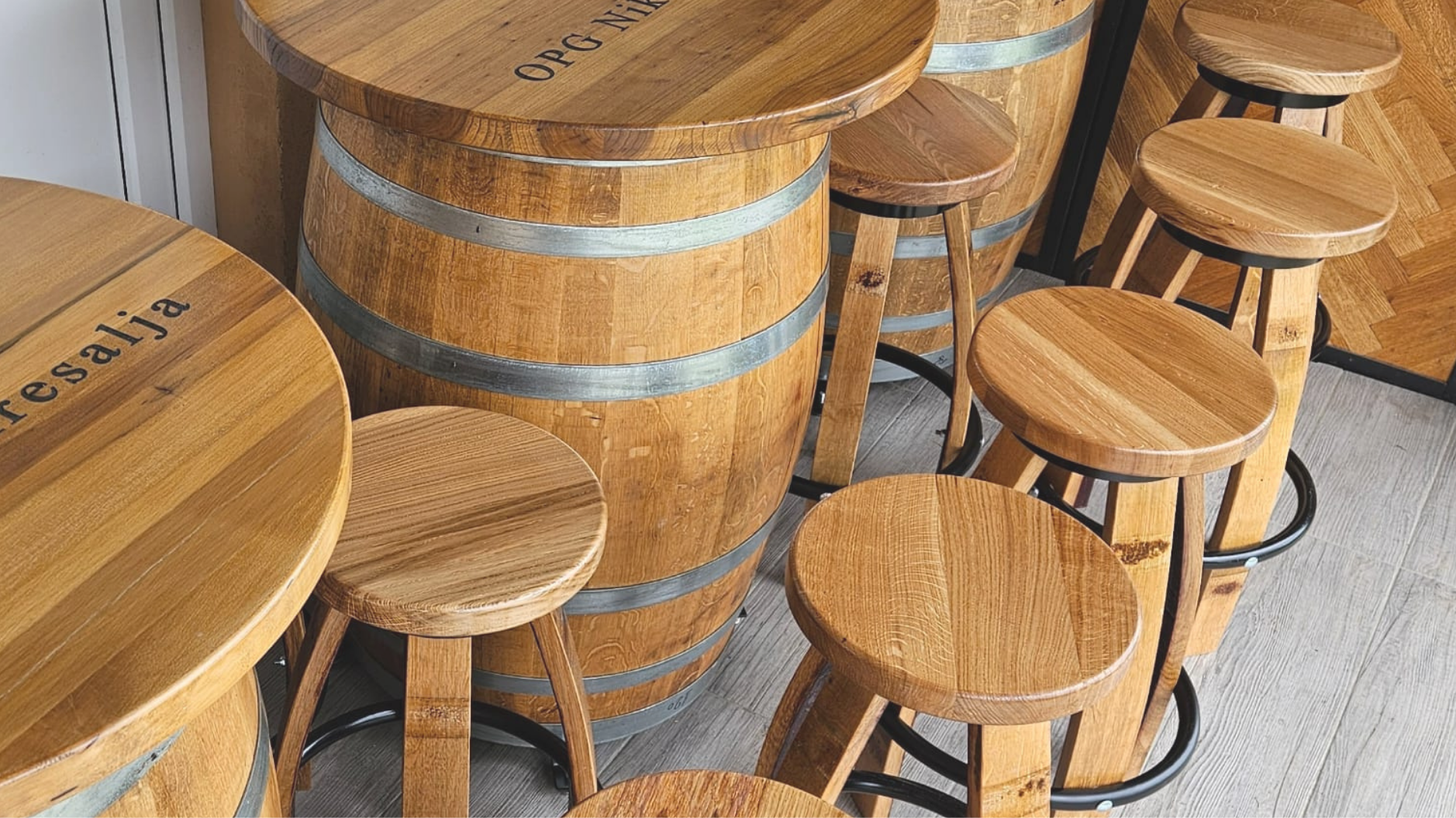Krenuli smo od jedne stare bačve koja nam se našla na putu dok smo čistili spremište. Gledajući u tu bačvu i razne predmete oko nje, vizija je došla sama od sebe! Tako je nastao prvi stol od bačve s ugrađenim policama, hladnjakom, pločom od starog drva i LED svjetlima!